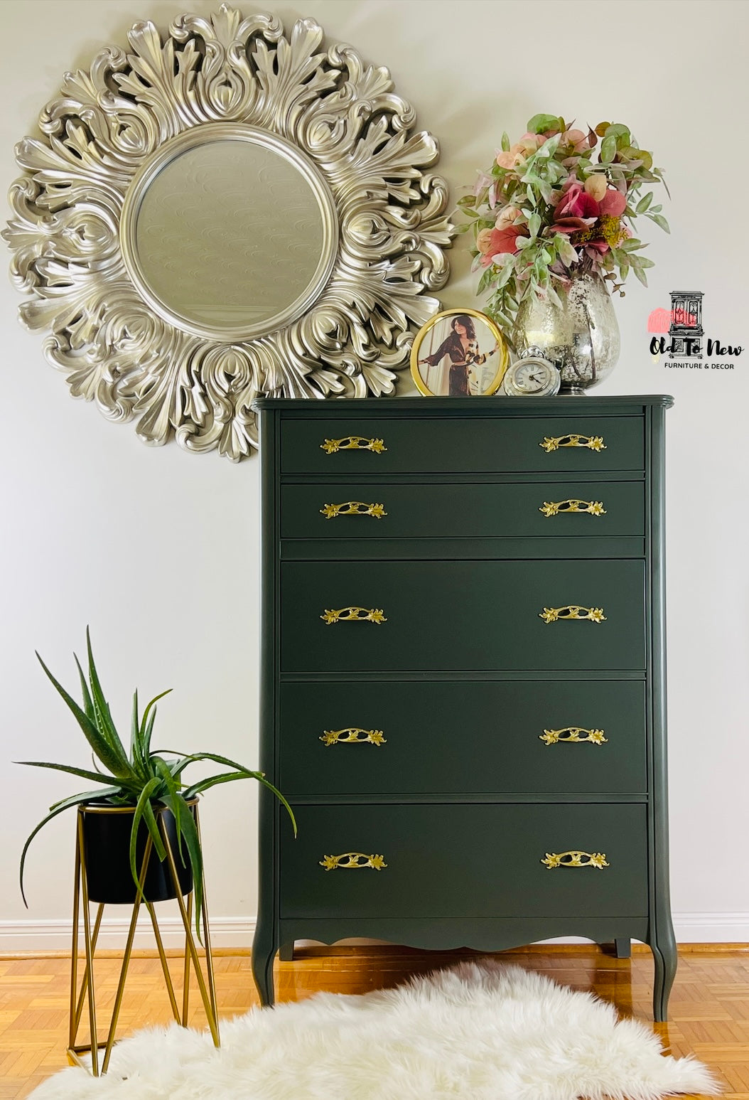 Gorgeous set of bedroom furniture; tall armoire dresser. Painted in the color Everett from Fusion Mineral Paint. This color is a mid-tone olive green that's very calming and organic in appearance. Set was listed in our unfinished inventory and we took the leap to paint it and have it ready for a modern home. Its ready to be shipped delivered or picked-up at our location in Mississauga, Ontario.
