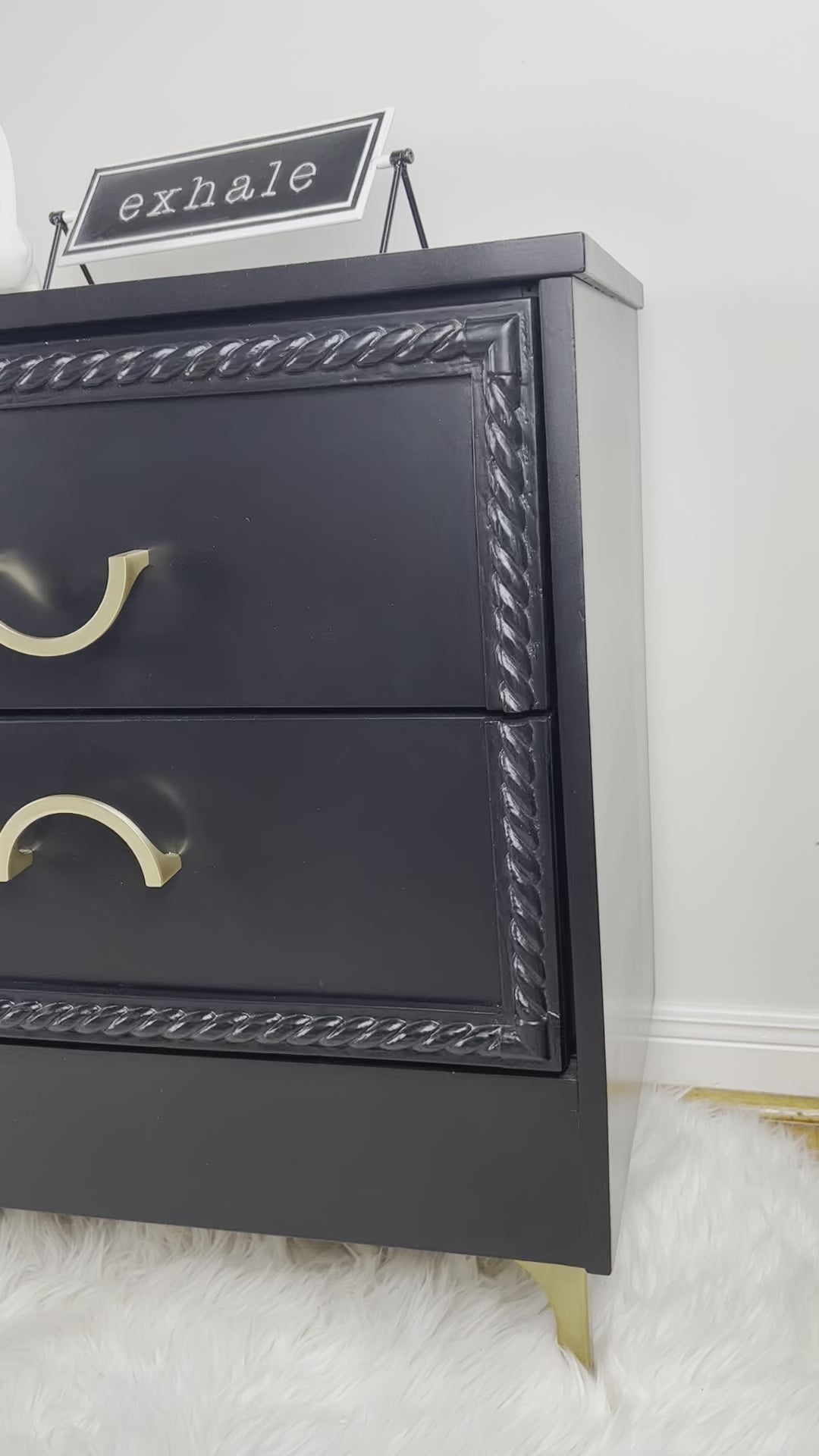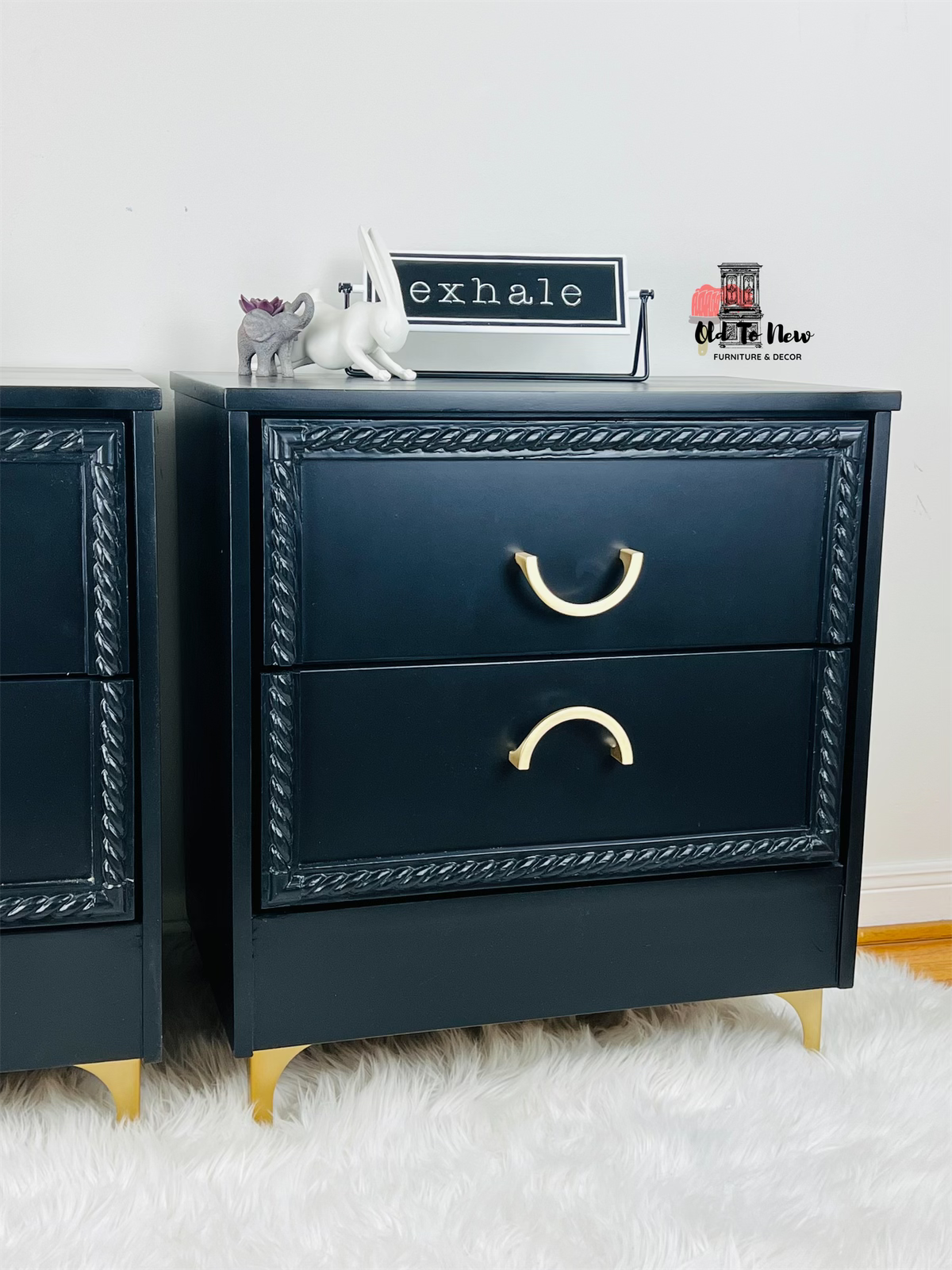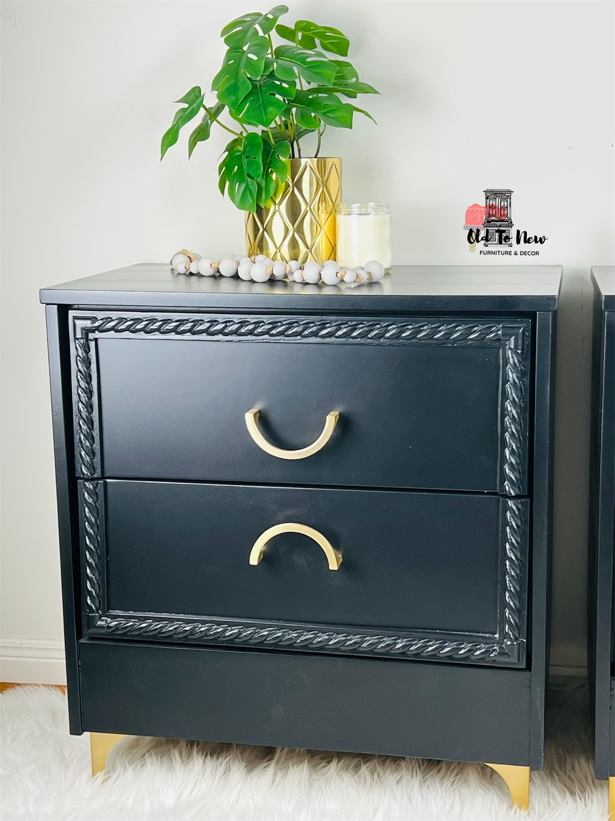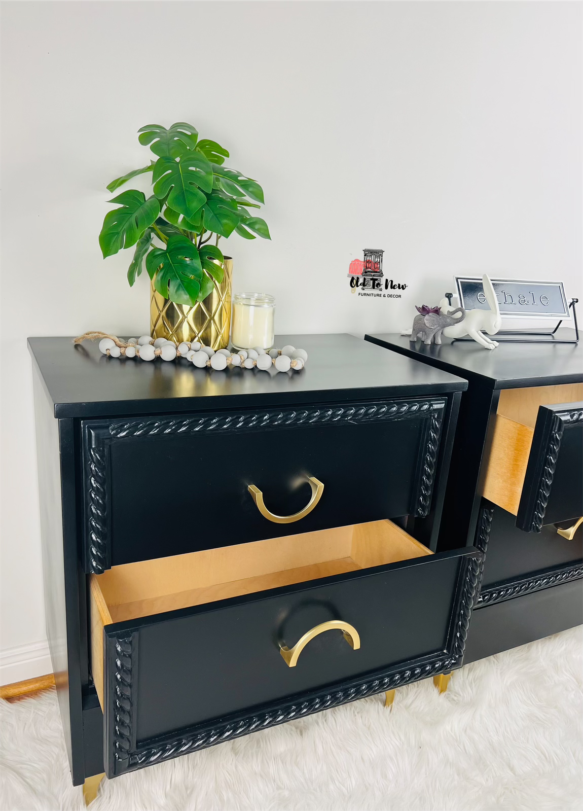 These Black Hollywood Regency Style Bedside Tables are just stunning and well suited for a modern home decor. Painted black to showcase their elegance and artistic details. They will bring a contemporary feel to your home, to keep your bedroom tidy and neat they are fitted with 2 drawers with ample storage. The strong gold legs provides good support and compliments the elegant gold handles creating a modern luxurious look.