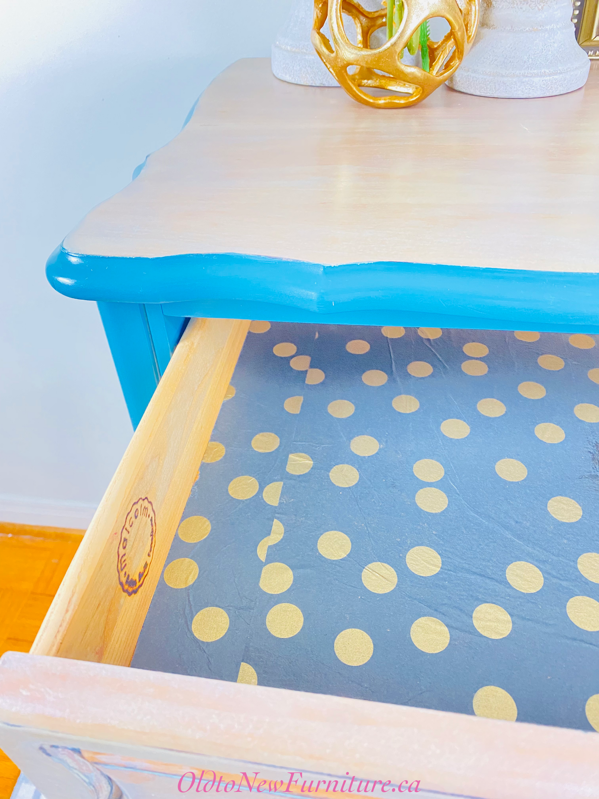 This blue and natural wood French Provincial sideboard is such a nice size. It contains a smooth sliding top drawer that extends the entire length of the unit and storage at the lower portion with a shelf to keep item organized. It's a size that's well suited for an entry way or foyer to keep your valuables tucked away or a dining room in urban setting. The casters are versatility and encapsulated an antique retro charm; this piece will add sophistication and charm your home decor. The unit is a Andrew Malcom rendition that's well built and will last many years to come.