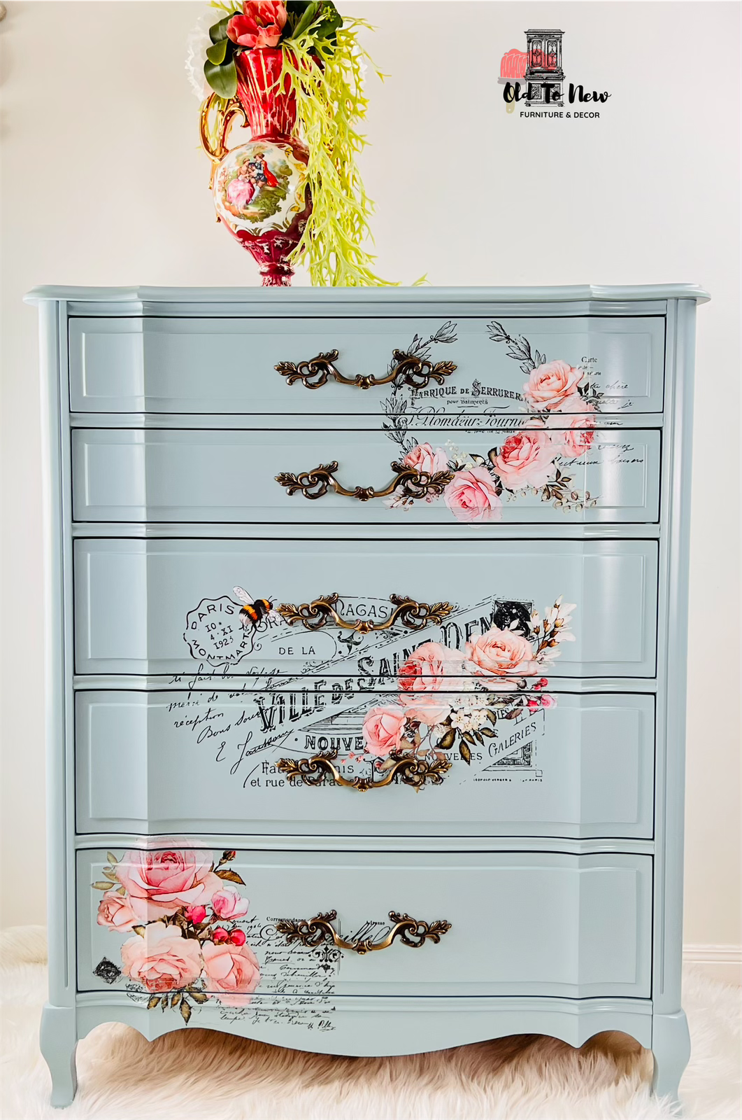 Stunning French Provincial dresser picked from our unfinished inventory; color, finish and design customized by our customer. Painted with fusion paint captivated by Ville De Saint Image Transfer from Hokus Pokus