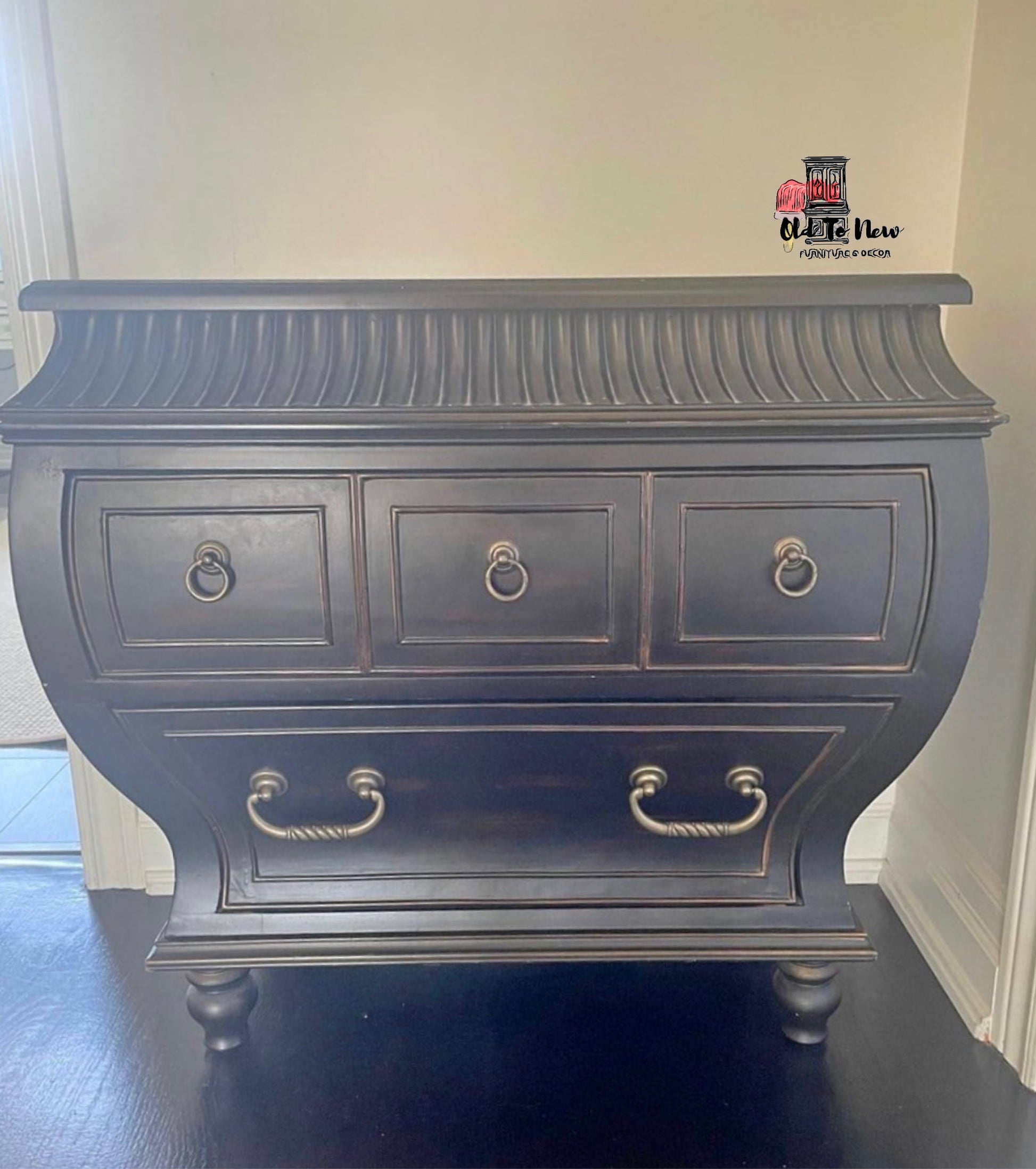 This fabulous Bombay chest is a perfect example of furniture art; there’s much to be desired with the bodacious curves and eccentric details. Our client purchased it unfinished and was specific in her desire to completing this beauty. When you visit the unfinished furniture collection on our website you can purchase a special piece and have it customized to compliment your home Decor.