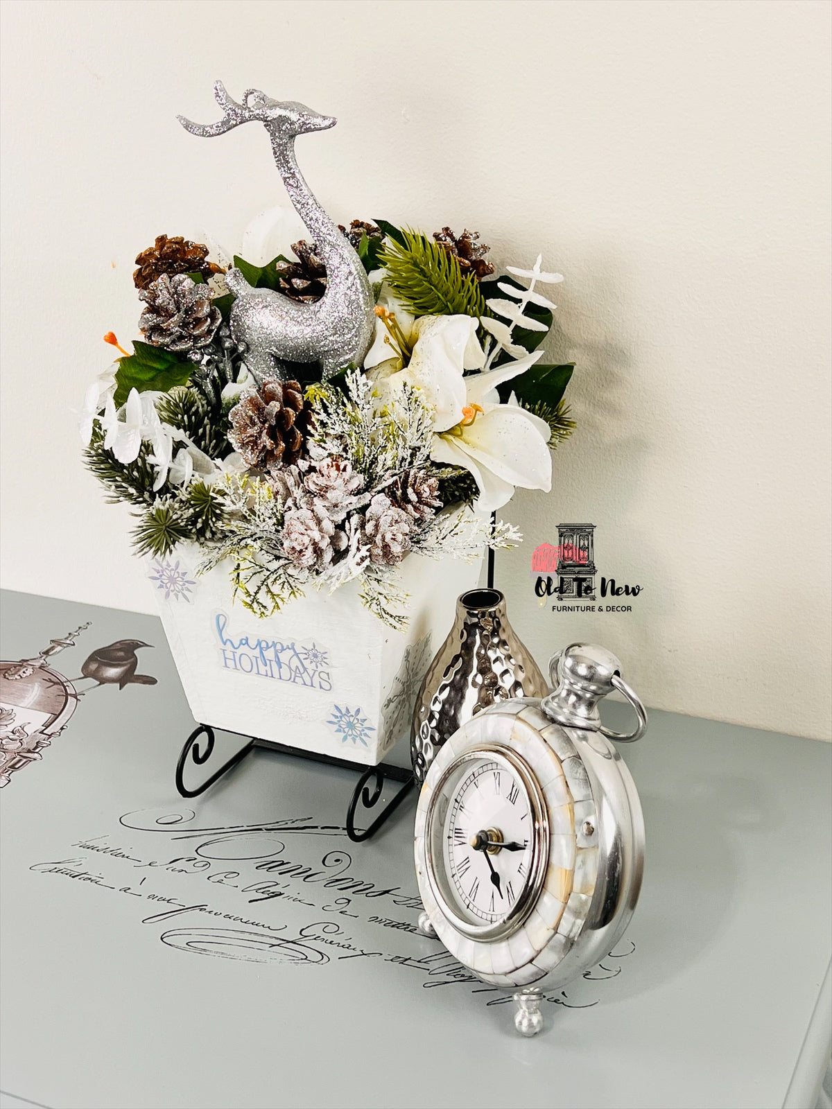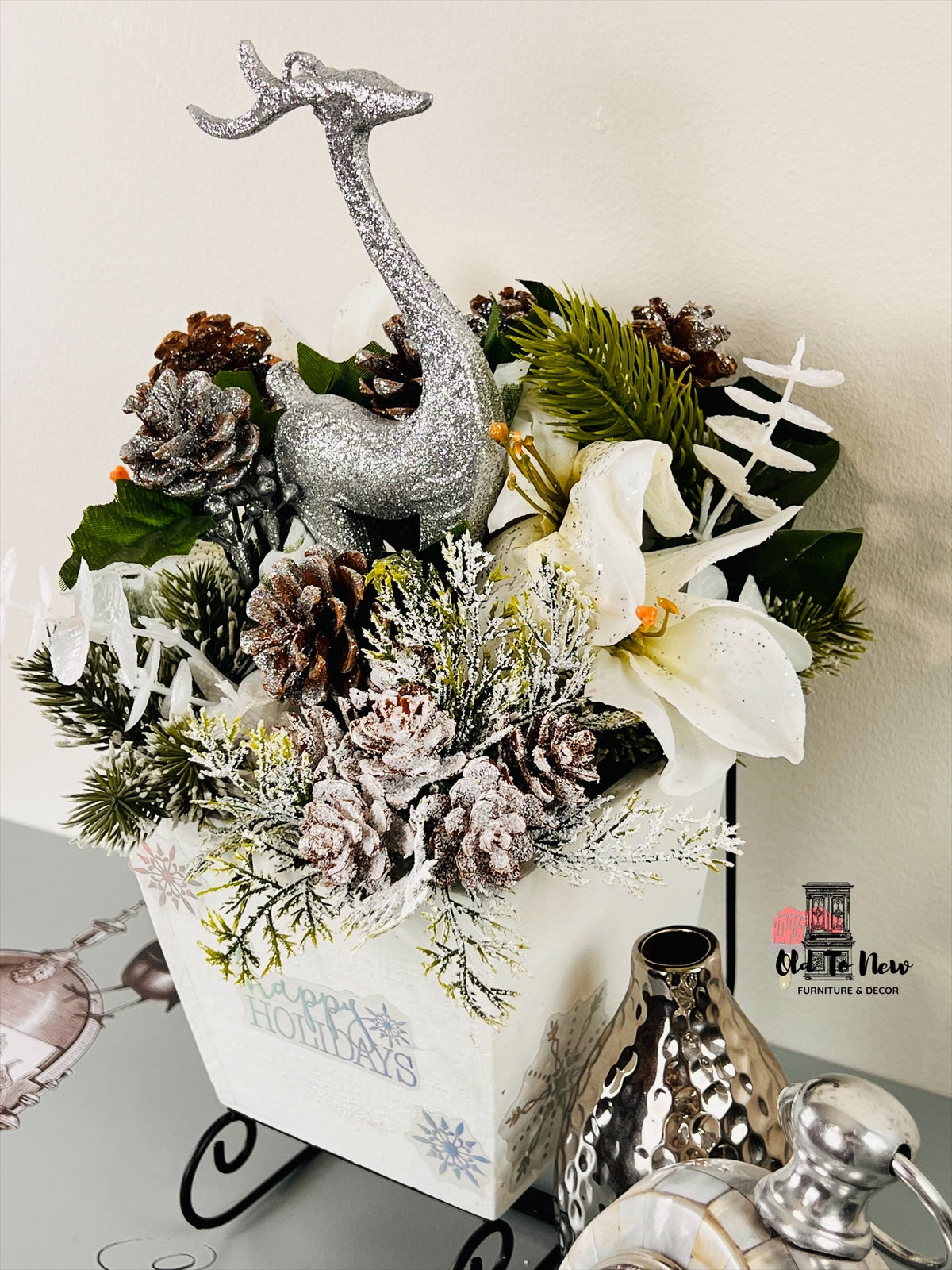This white and silver Christmas floral arrangement is complete with artificial flowers and dry pine cones and would make a sensational side table, entryway or bathroom decor arrangement over the Christmas holidays. The color combination is calming yet the piece sparks excitement for the holiday season with the majestic wooden sleigh container and the gorgeous reindeer as a focal point for the arrangement.