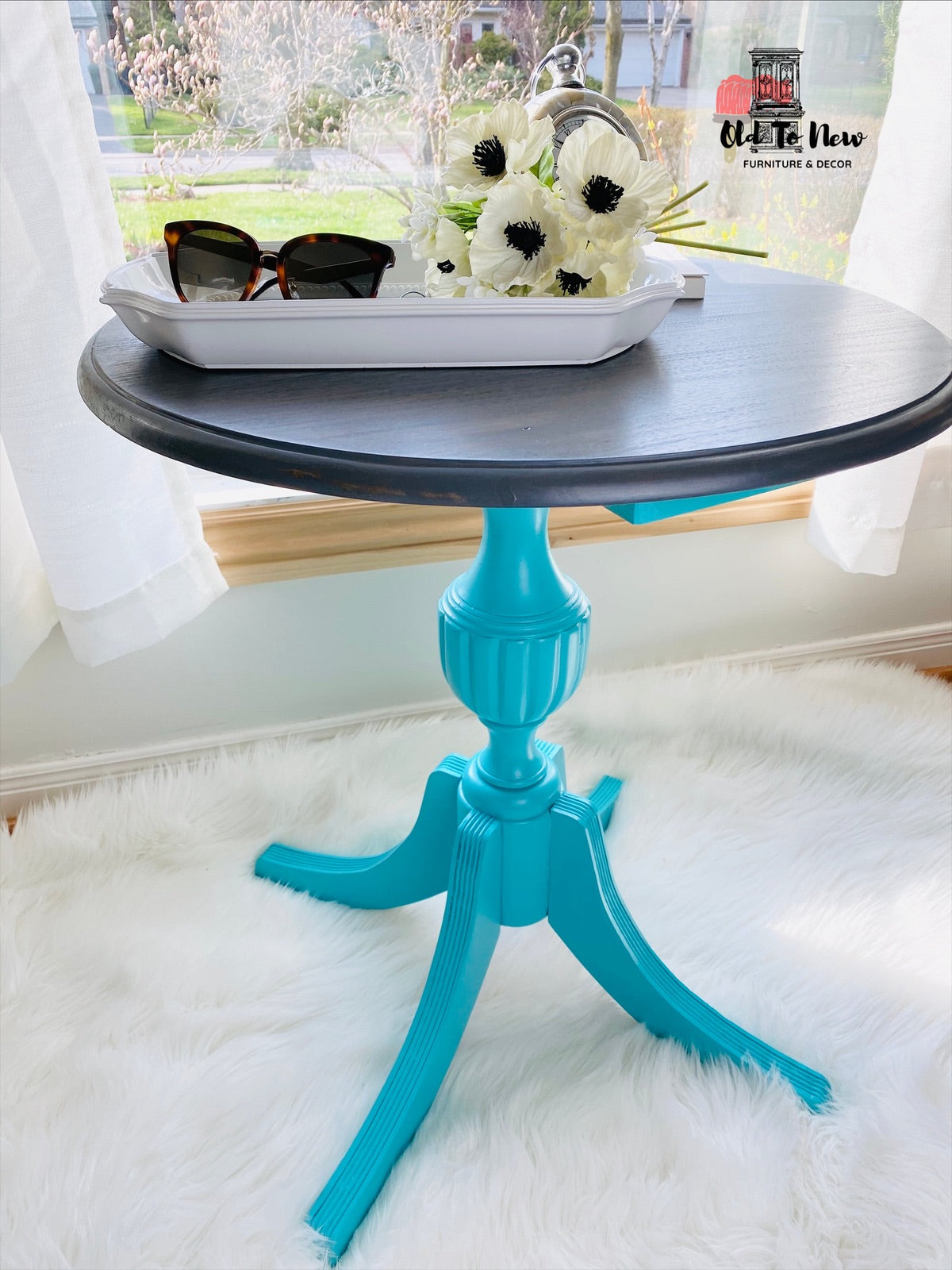 Super classy aqua blue colored accent table. Base painted in Annie Sloan chalk paint, top stained with a light grey from General Finishes; top and bottom sealed for durability.