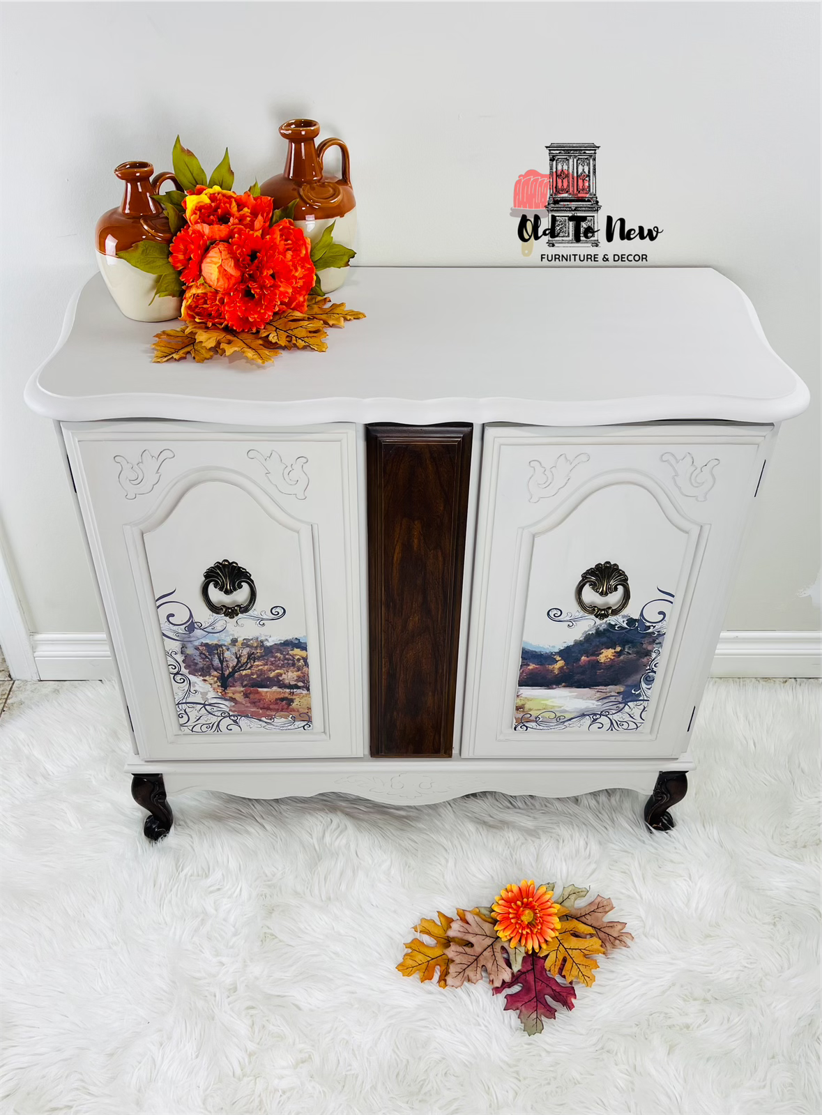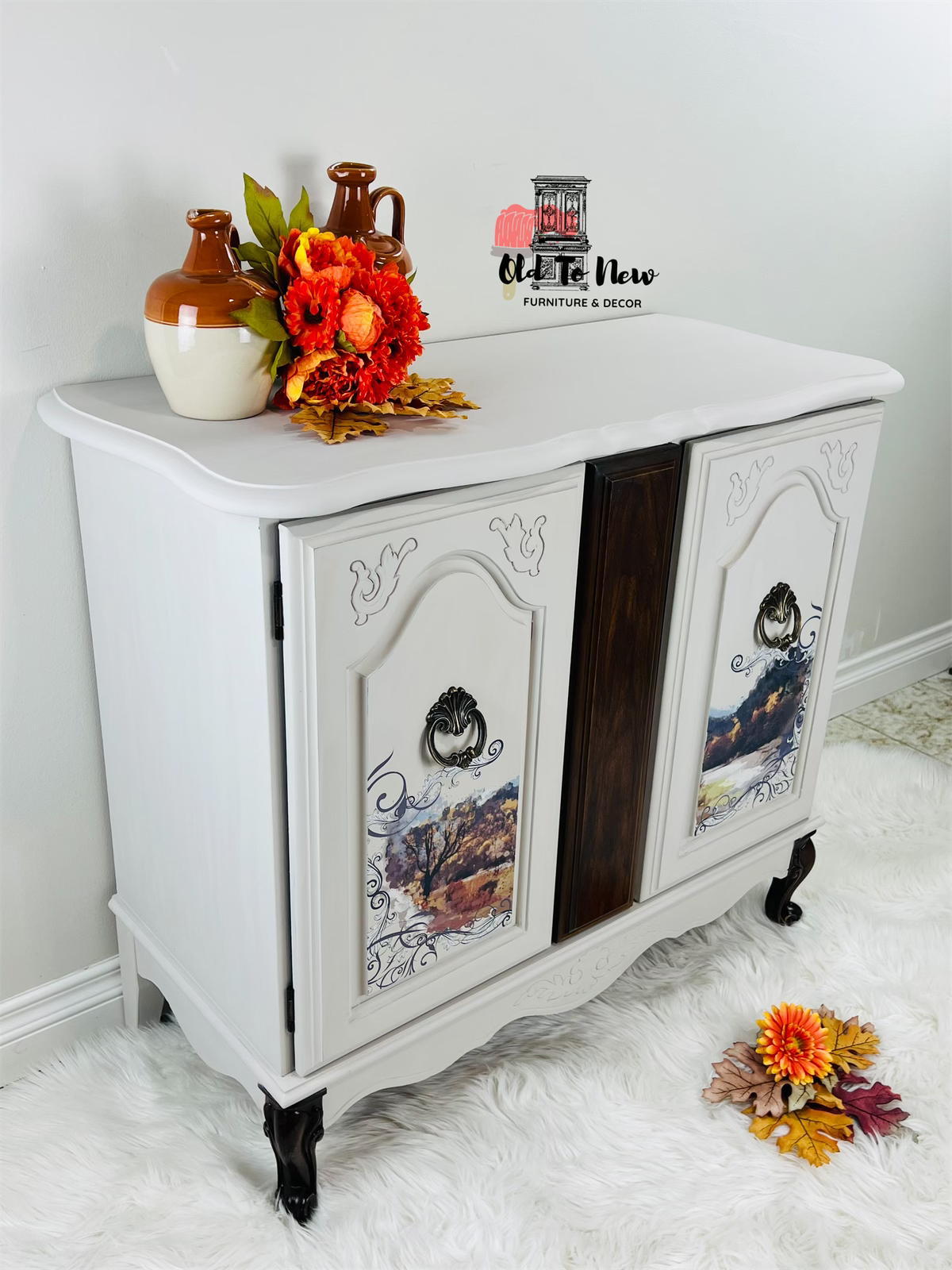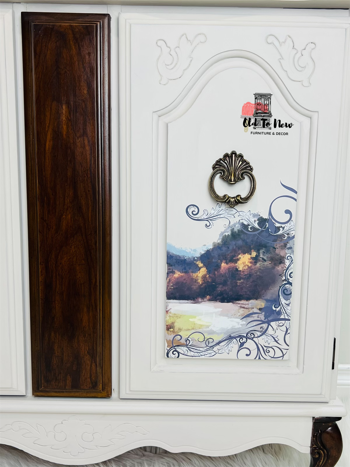 Looking for a stunning sideboard we have this beauty available it was painted with our very own custom blend of Annie Sloan Chalk Paint and our Hokus pokus Seasons transfer. We kept it neutral with a bit of a story to the front showcasing this gorgeous landscape view. Some of the natural veneered wood elements retained to compliment the transfer image. There's shelving for storage and a nice drawer tucked away on the inside.