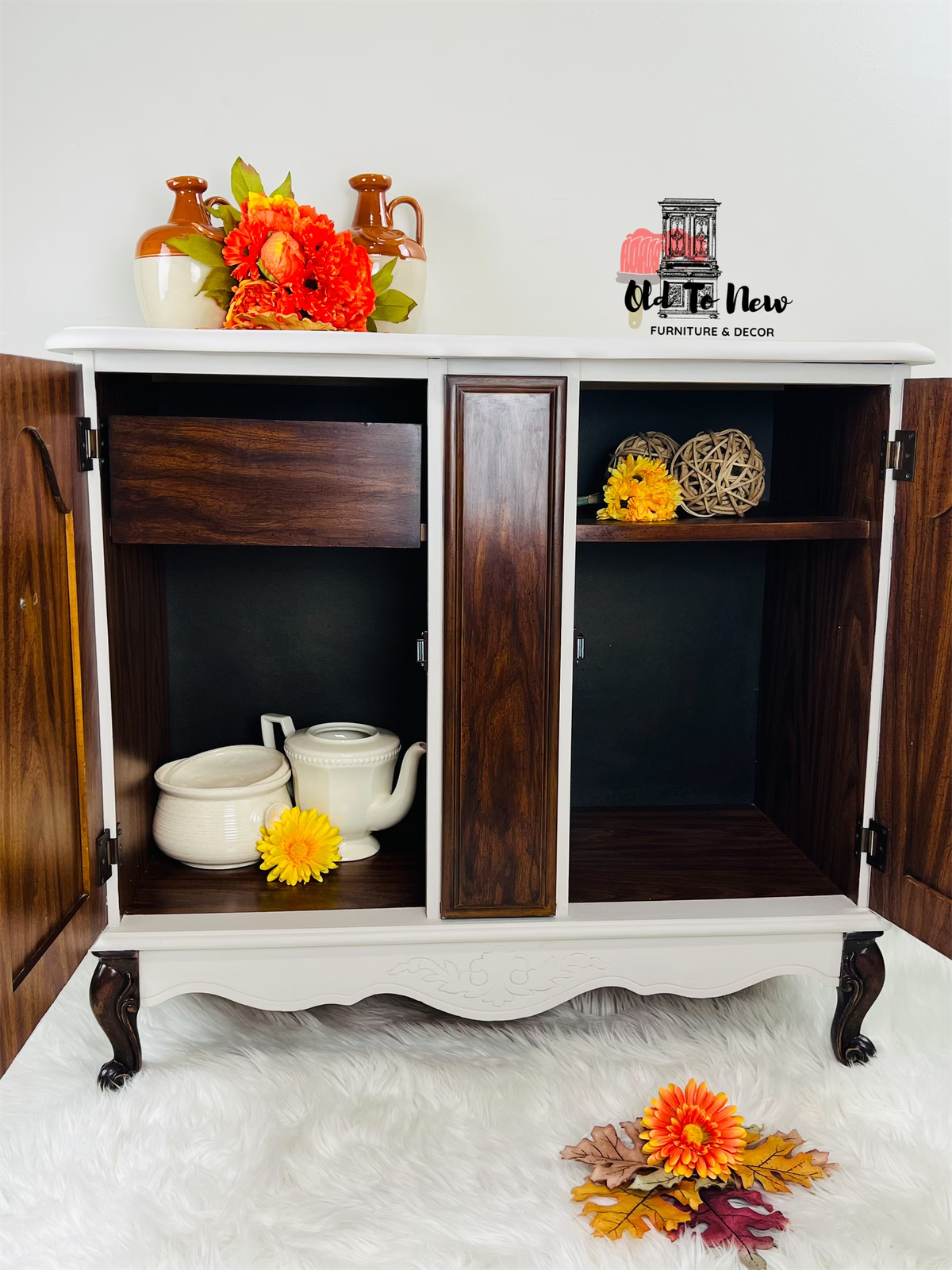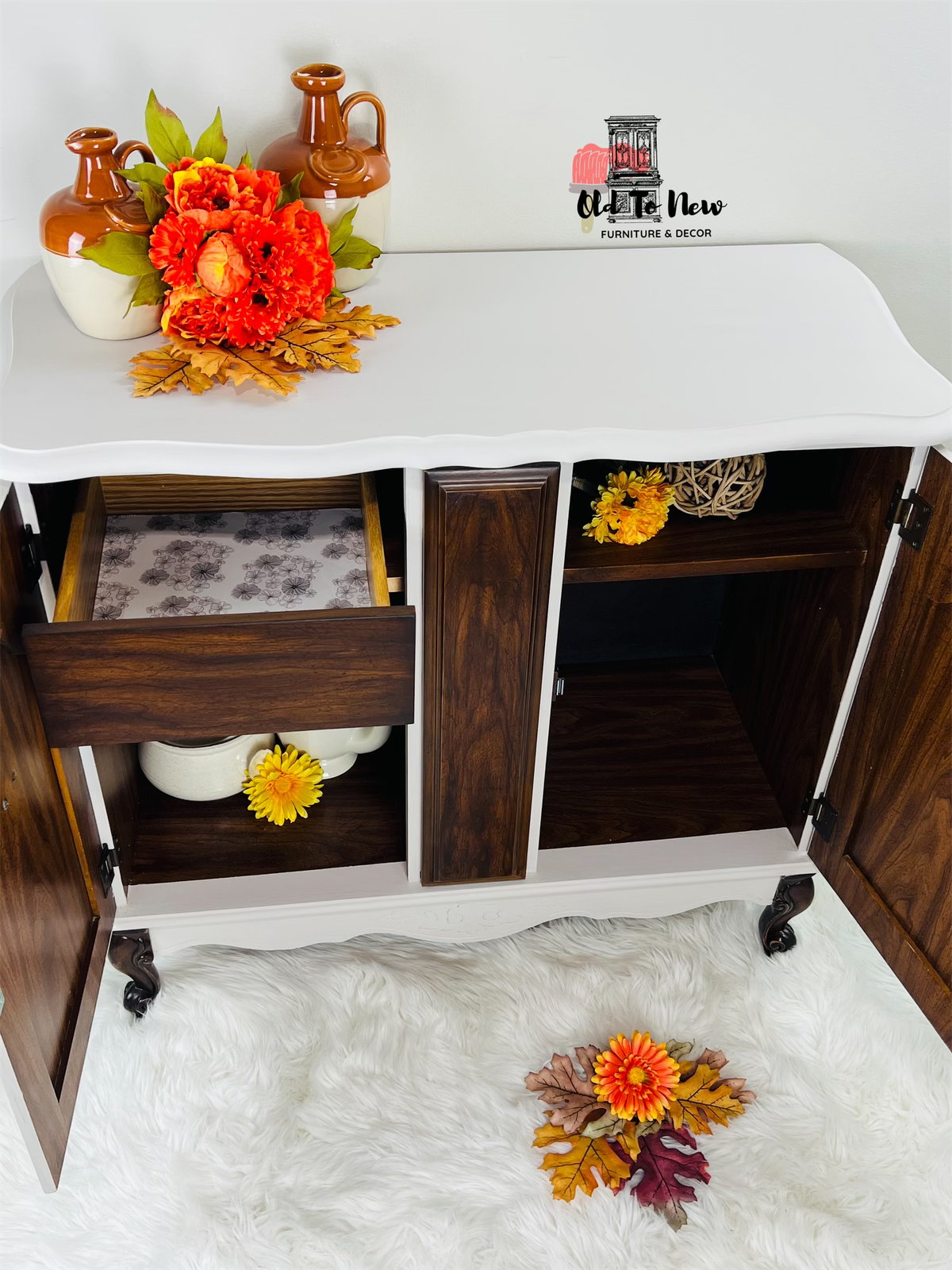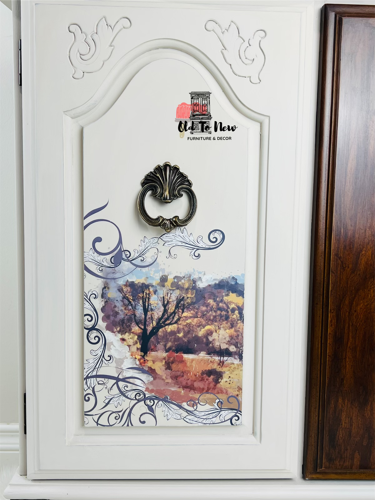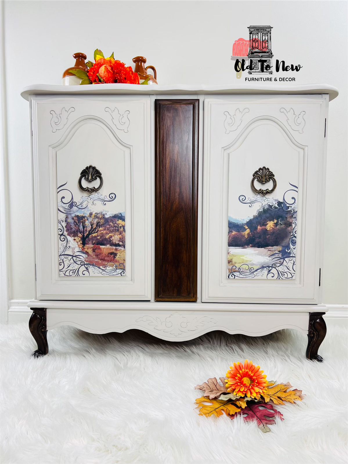 Looking for a stunning sideboard we have this beauty available it was painted with our very own custom blend of Annie Sloan Chalk Paint and our Hokus pokus Seasons transfer. We kept it neutral with a bit of a story to the front showcasing this gorgeous landscape view. Some of the natural veneered wood elements retained to compliment the transfer image. There's shelving for storage and a nice drawer tucked away on the inside.