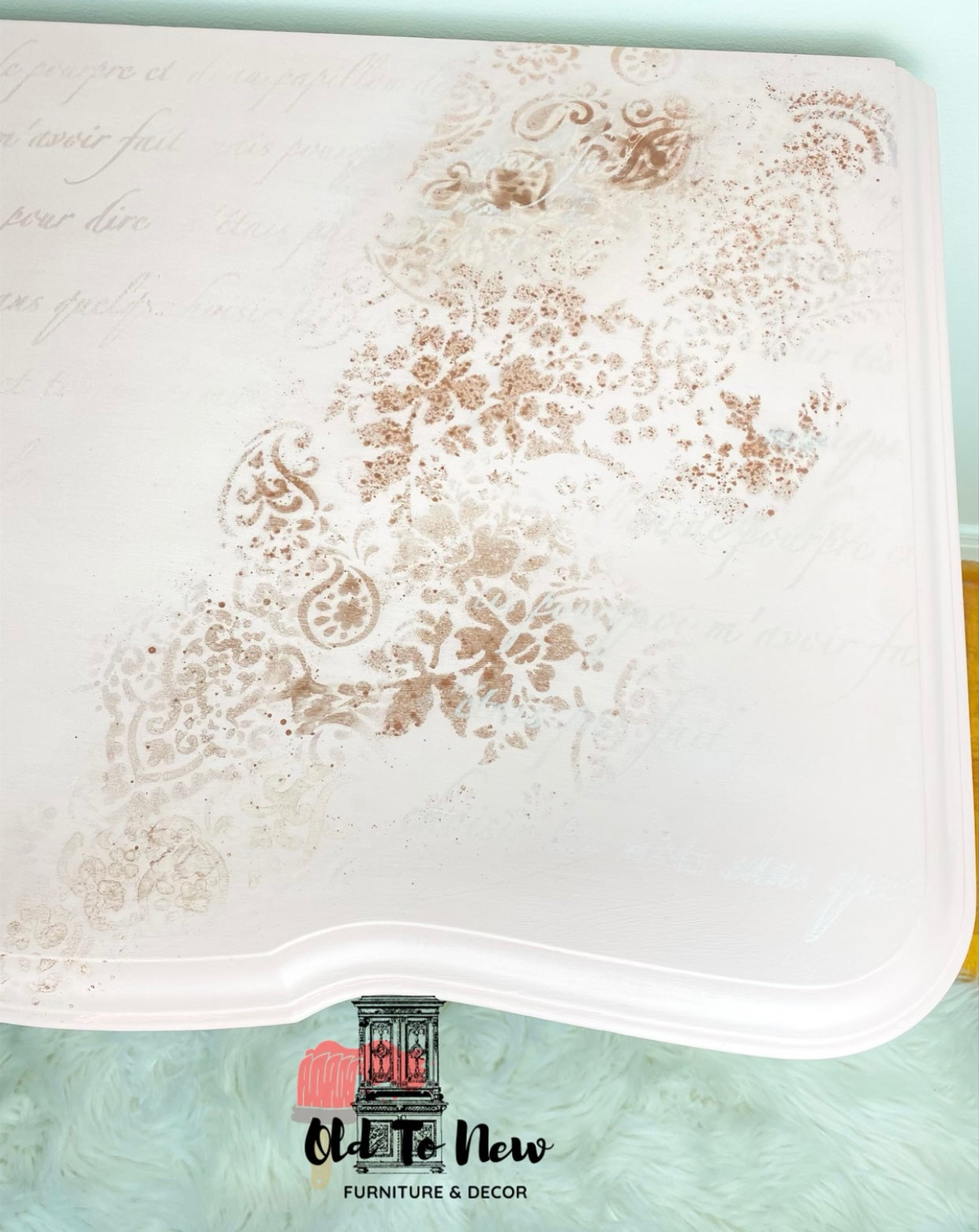 We stencilled the top, side panels and the sides of the drawers to add elegant details to the end table, we refinished the hardware in copper to compliment the stencilled details. The blush pink and copper combination makes this statement piece a one of a kind.