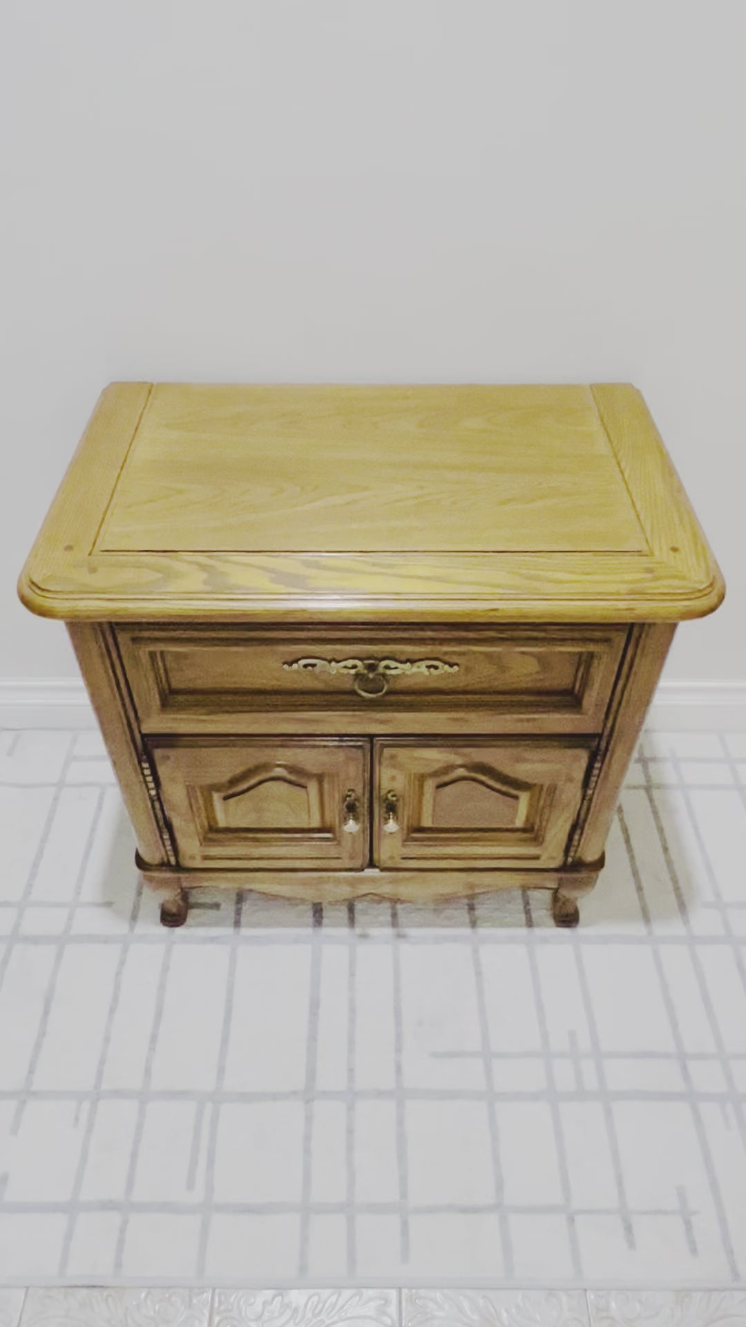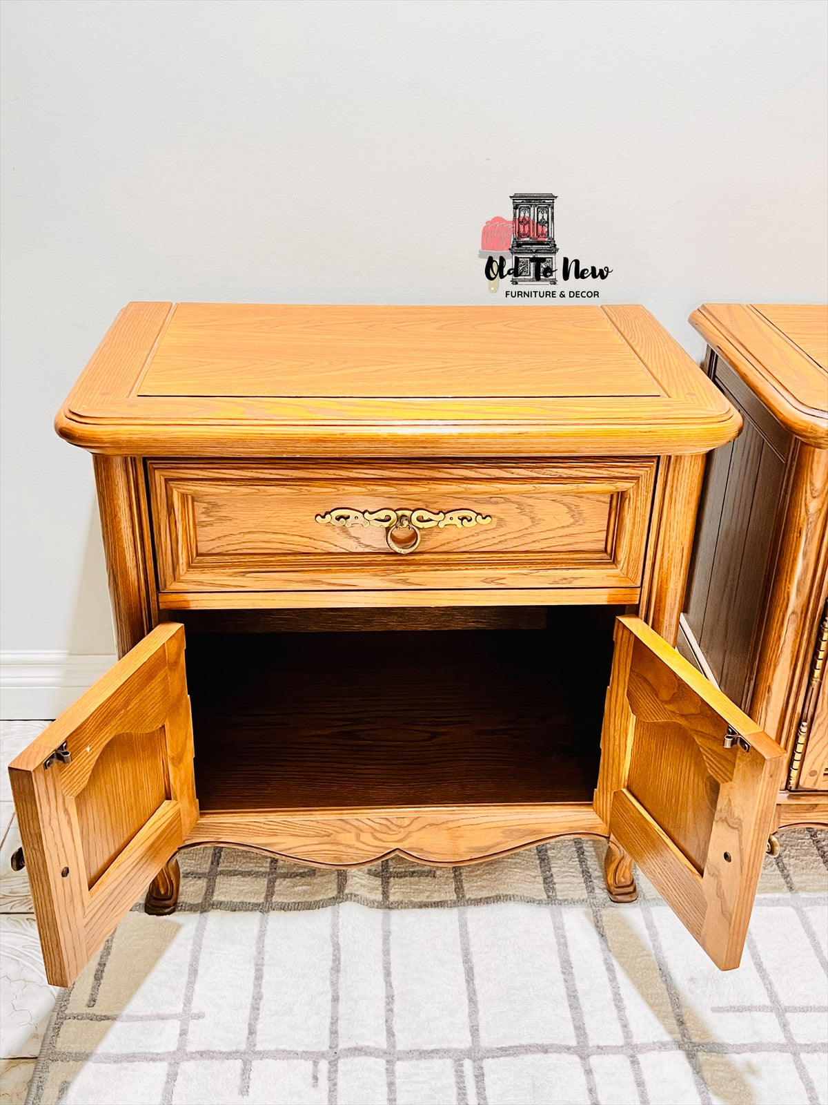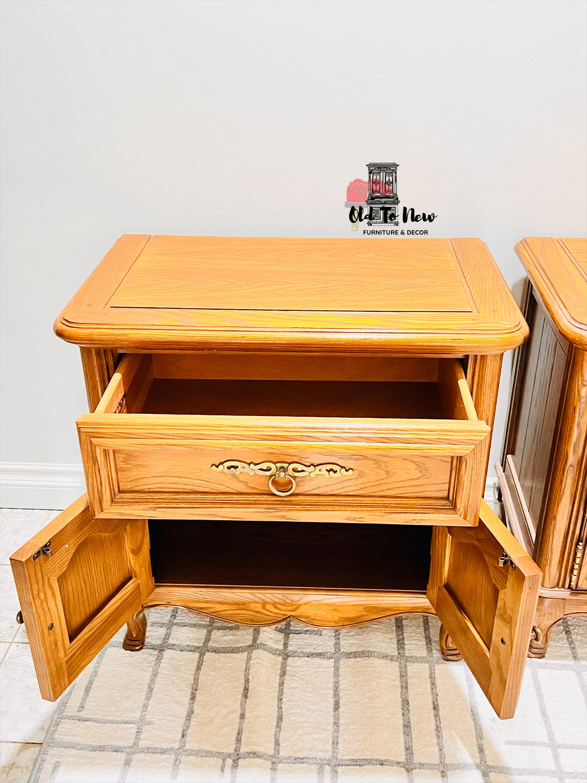 These gorgeous French Provincial end tables are exquisite with the most beautiful details; 1 top level full size sliding drawer and a bottom level double door storage opens up to abundant storage. Both available to be customized in your choice of paint color. The cost to refinish the set of these tables is $860; one color- addition charge for more design elements. If you'd like to make these yours please message us.