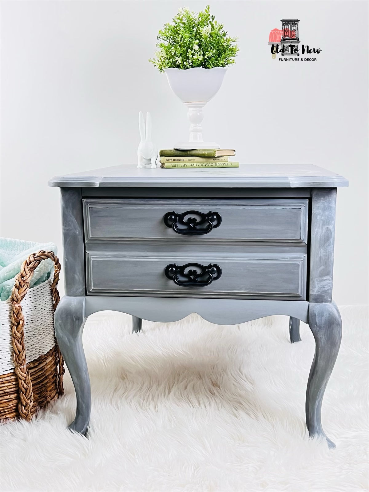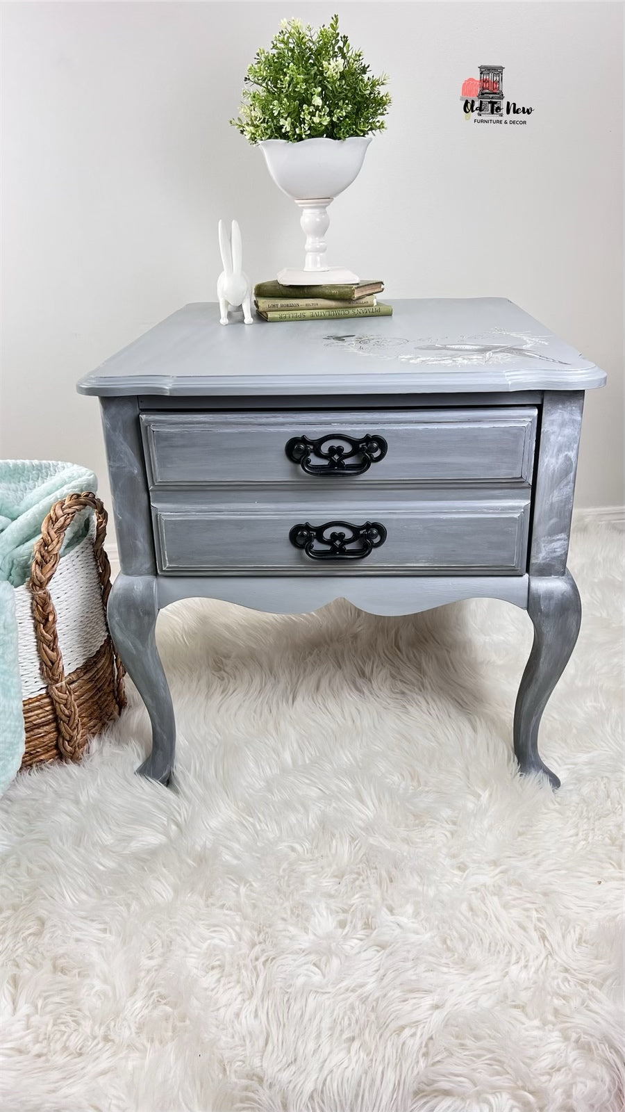 Grey Antique French Provincial End Table with Marbelled Effect and Hokus Pokus Decor Transfer