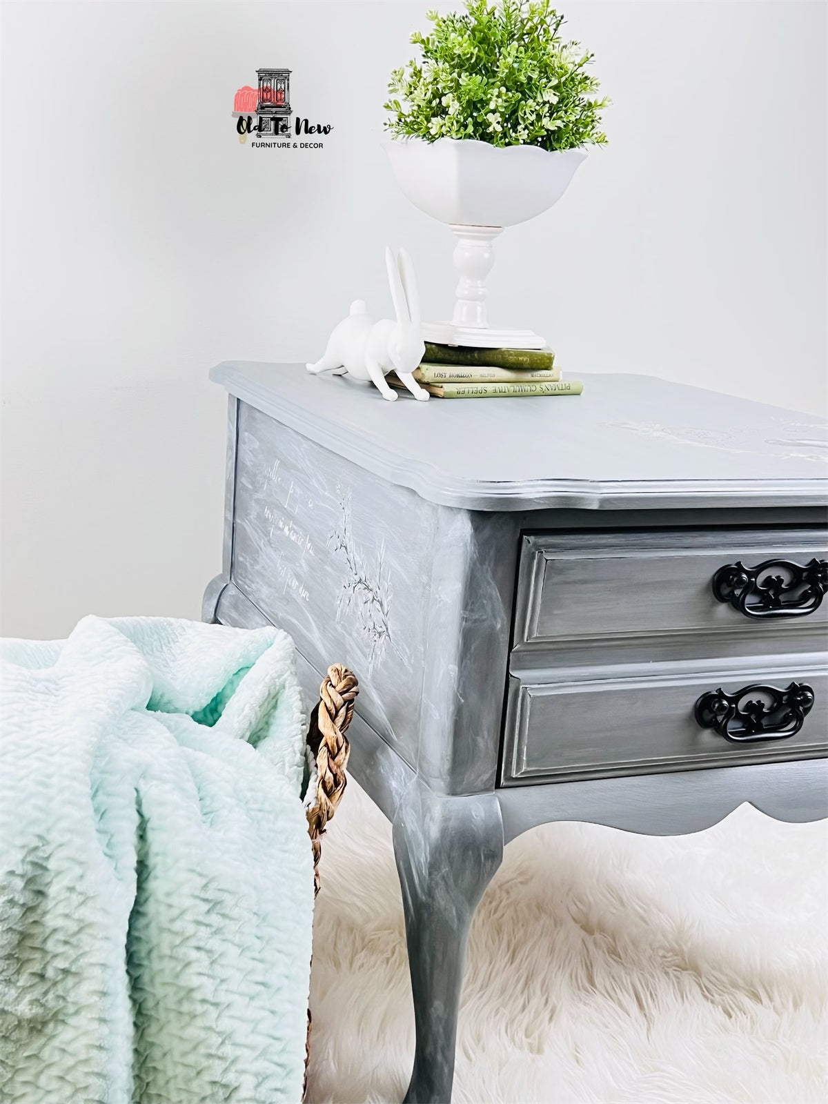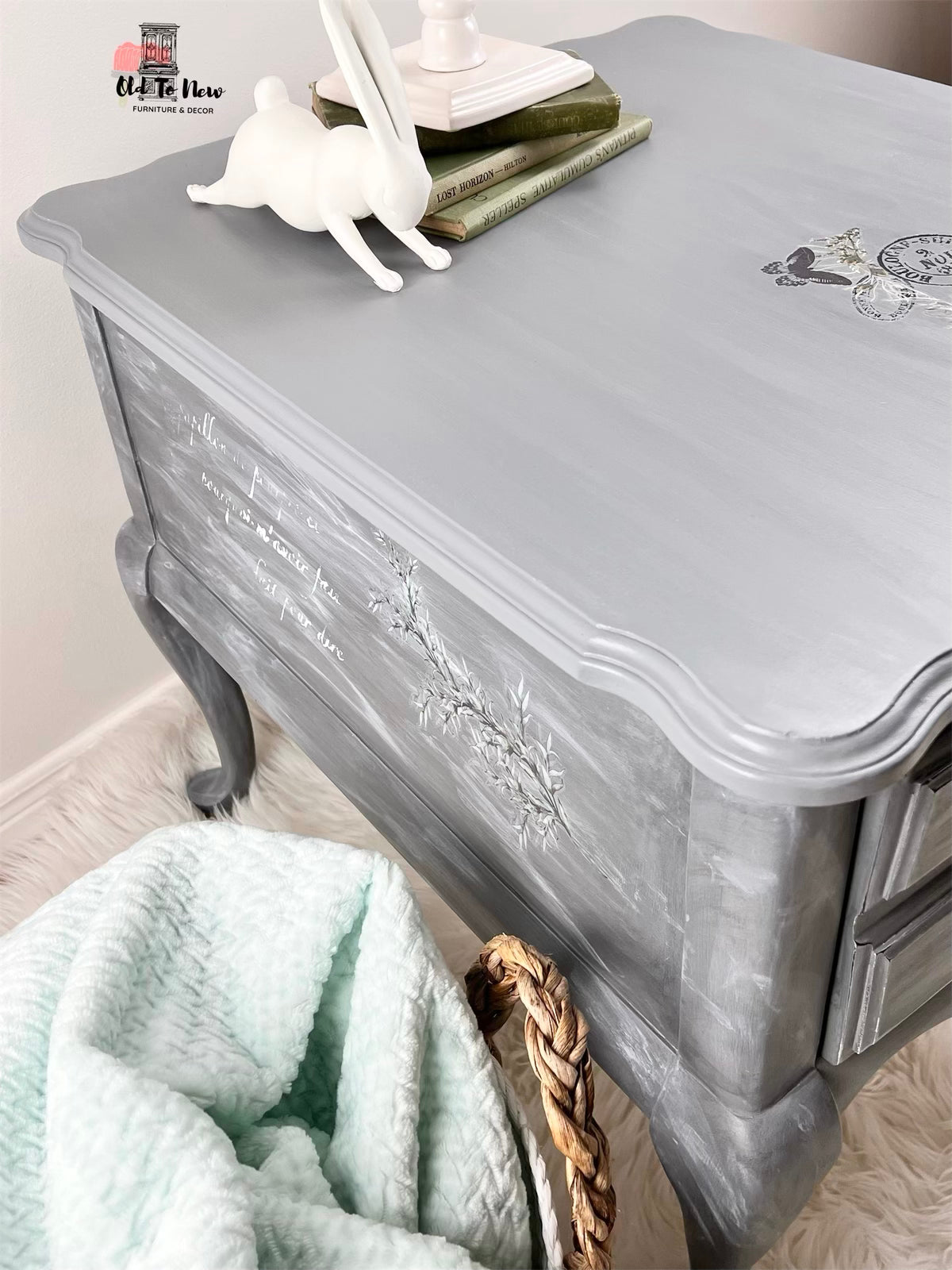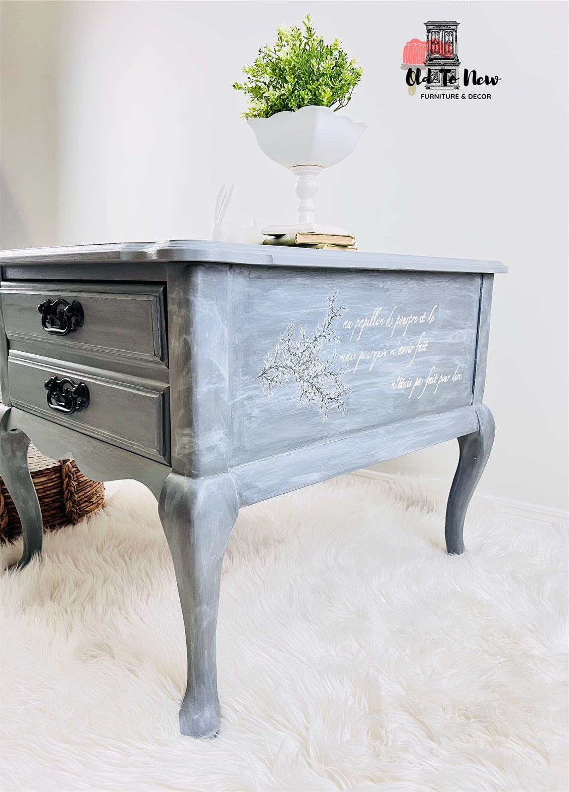 This eclectic style one drawer end table is the perfect compliment to any bedroom or living room a neutral grey that can that will bring style to your home. This table has so much character, completed with a custom mix of Annie Sloan chalk paint with several techniques and finishes resulting in the marbled effect; we used our very own L’horloge furniture transfer from Hokus Pokus. This piece will completely transform your room.