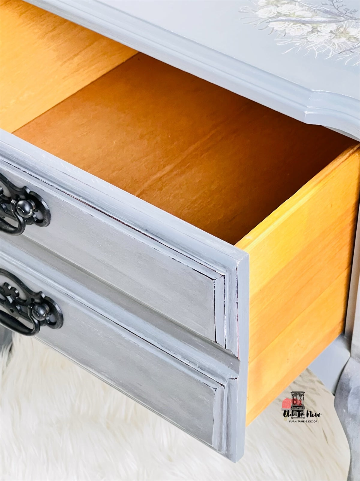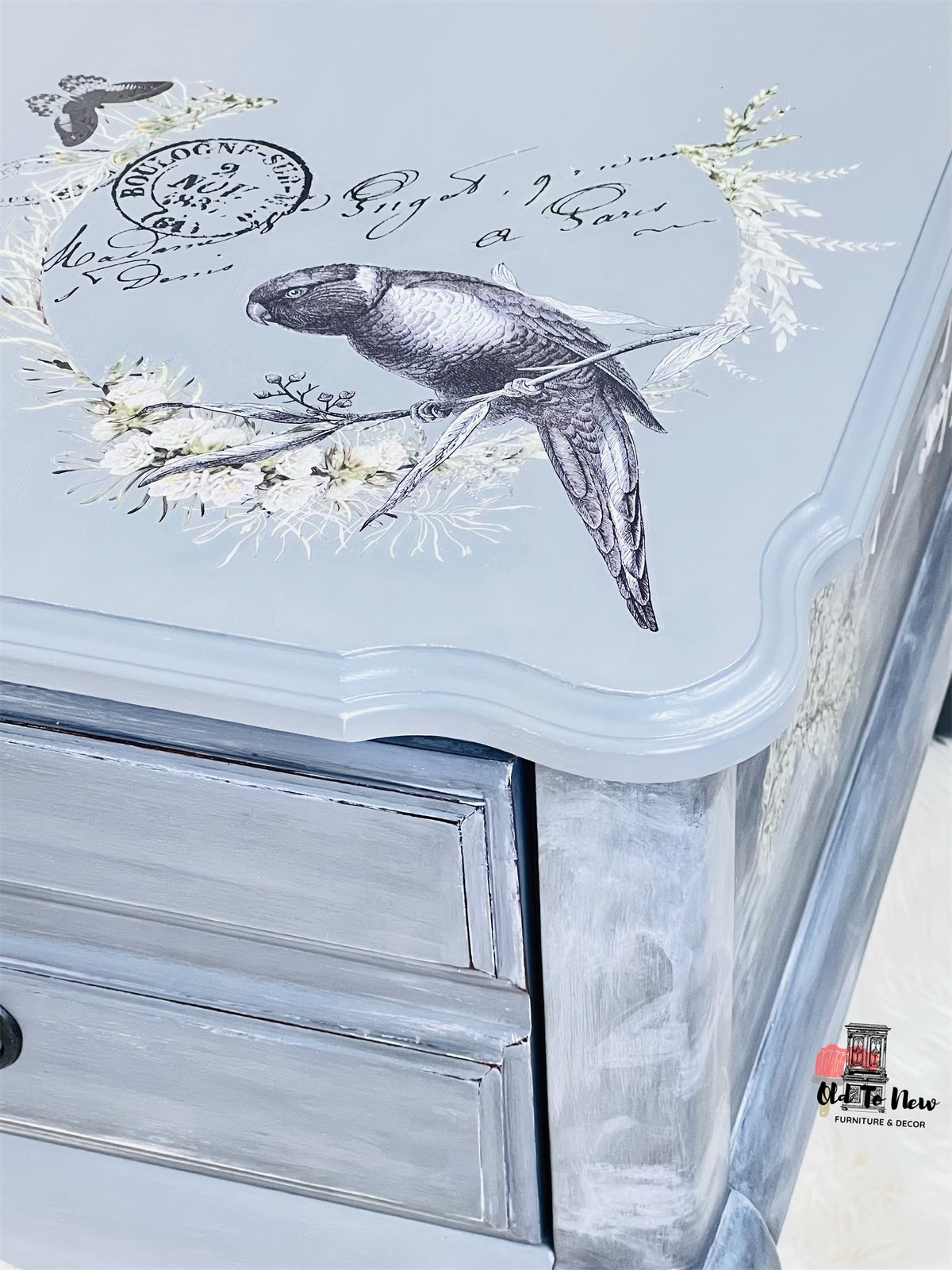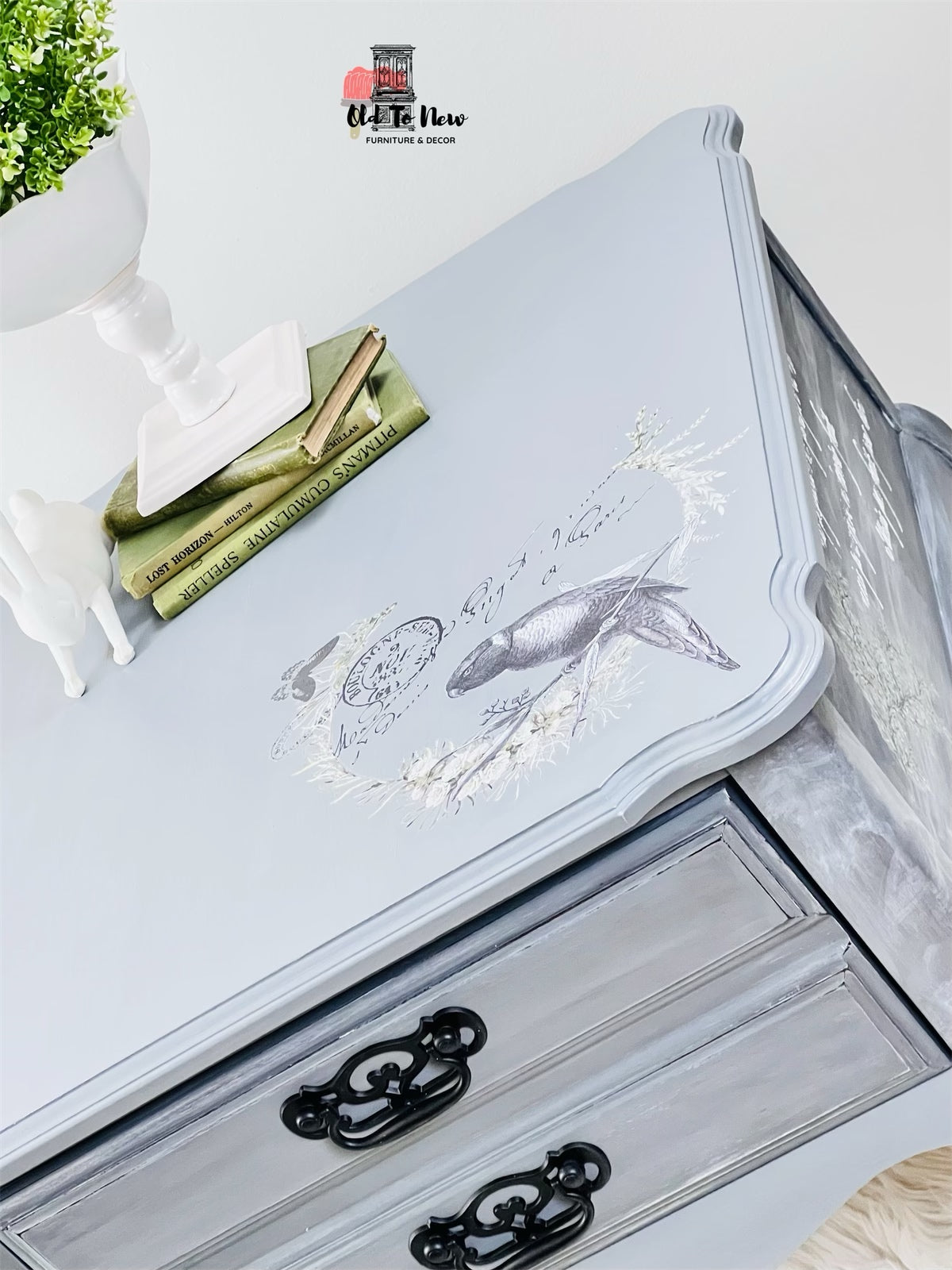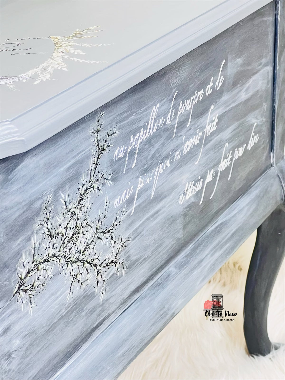 This eclectic style one drawer end table is the perfect compliment to any bedroom or living room a neutral grey that can that will bring style to your home. This table has so much character, completed with a custom mix of Annie Sloan chalk paint with several techniques and finishes resulting in the marbled effect; we used our very own L’horloge furniture transfer from Hokus Pokus. This piece will completely transform your room.