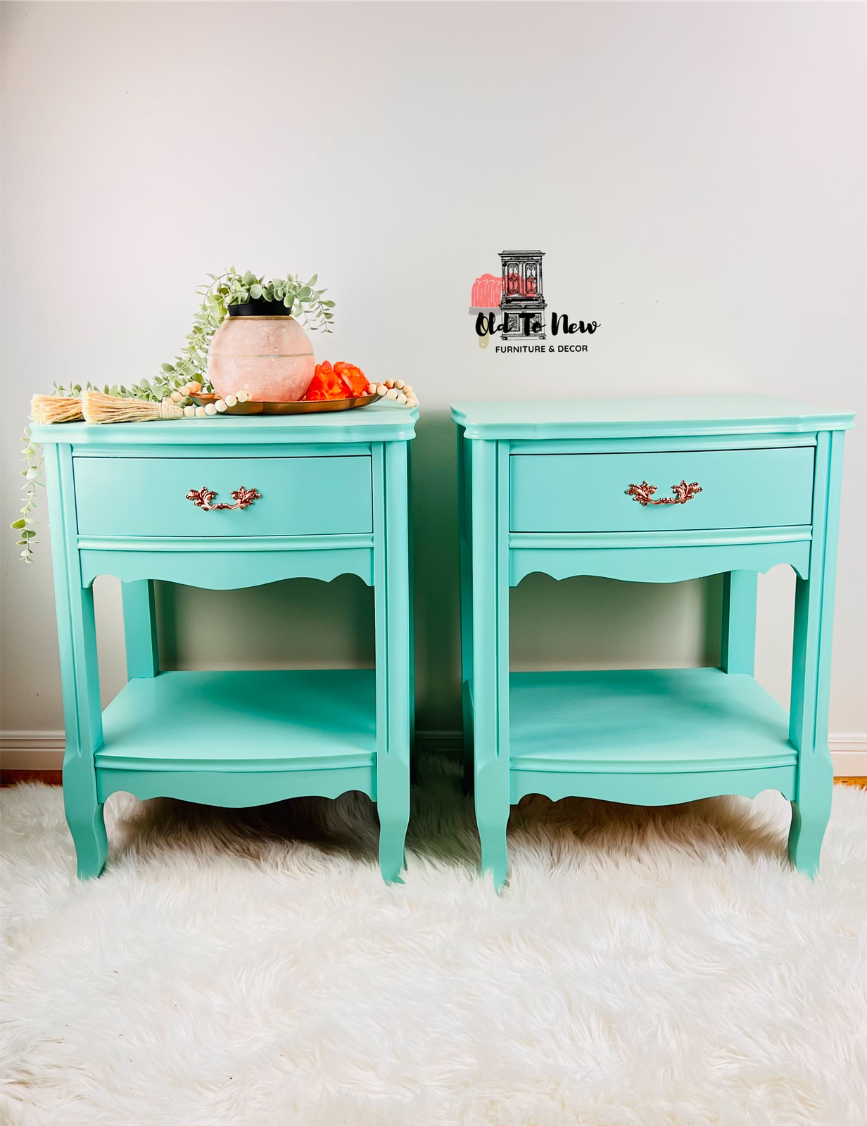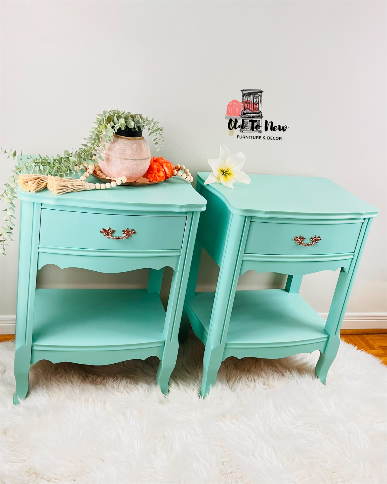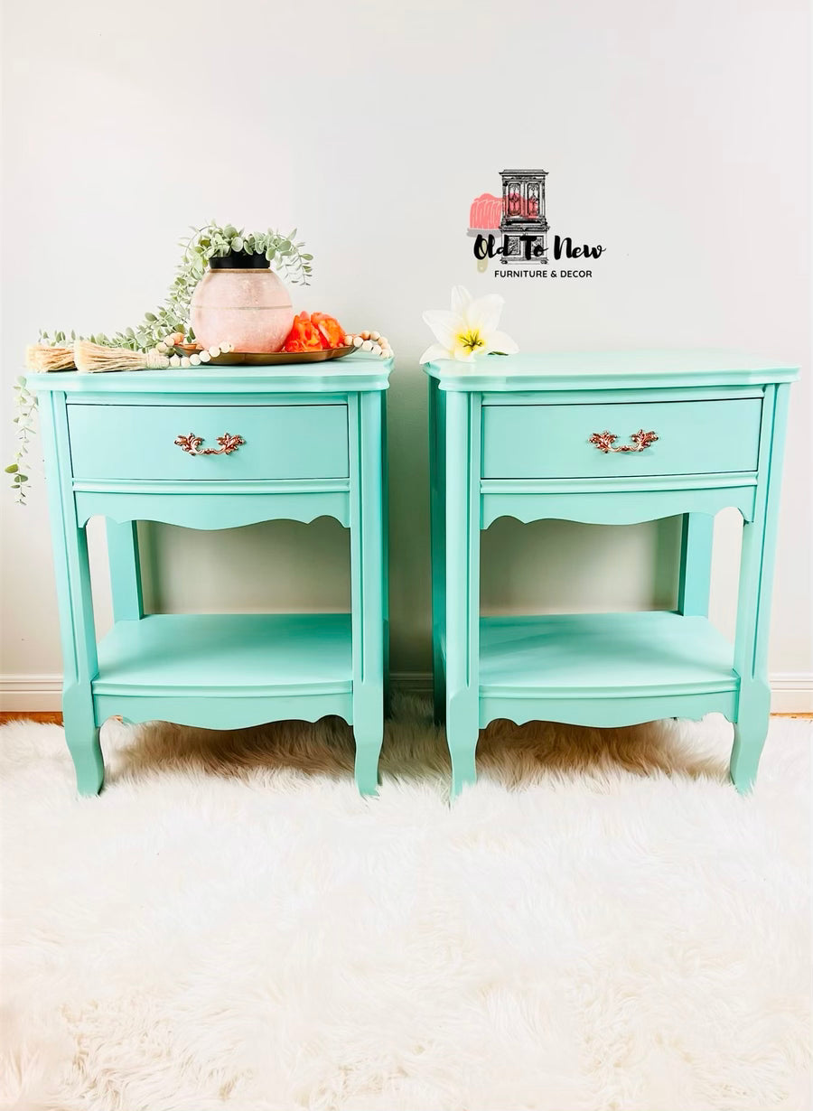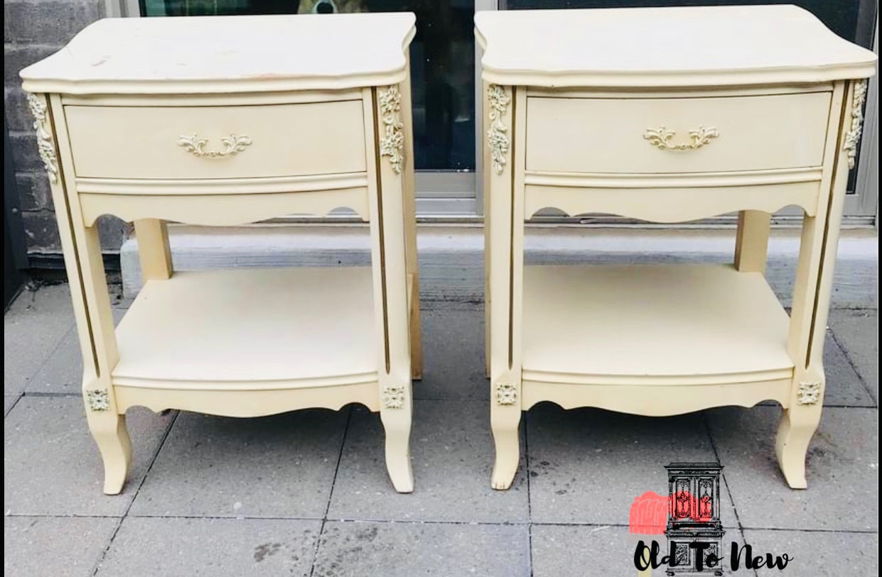 These gorgeous French Provincial End Tables were are a rare find for us. They were available to be customized from our unfinished inventory; got purchased by our customer in British Columbia along with some other French Provincial pieces. They were all painted this color, packaged and shipped by us.