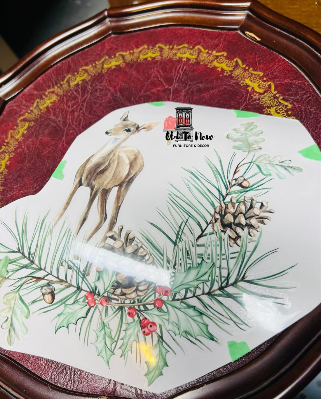 The perfect accent table for Christmas, just imagine this table next to your Christmas tree with cookies and milk for Santa!. We're excited to have this completed before the Christmas Season. Bring it home and enjoy this piece for years to come. Used gold paint and portions of our very own "When Christmas Comes" rub on transfer to accent the table top and base.