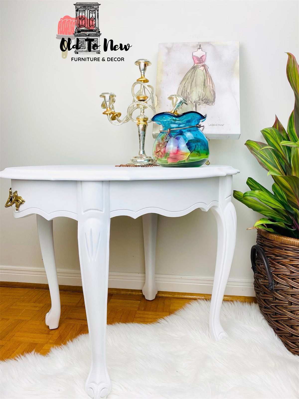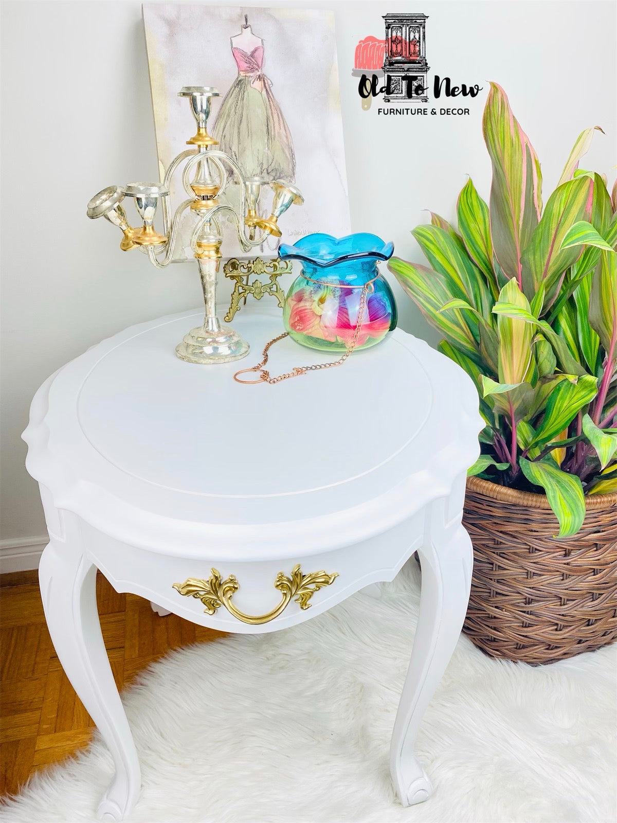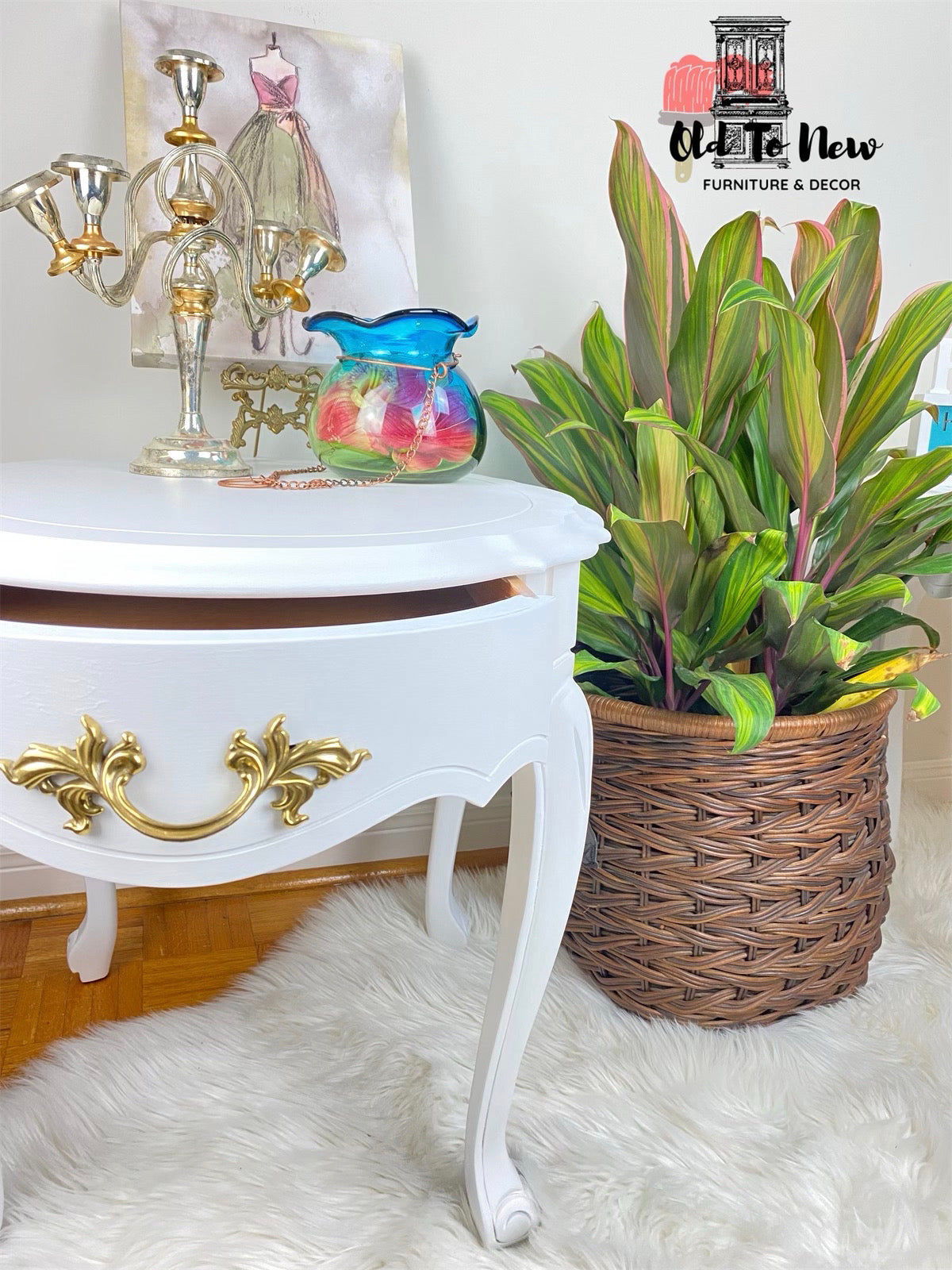 These French Provincial end tables have been painted with Victorian Lace from Fusion Mineral Paint; a beautiful off-white that's lends to more of a cool white with a crisp white tone. These are classical oval table that's beautifully designed by Deilcraft; I can't paint enough of these tables to ever be satisfied!. They have been top coated to ensure durability.